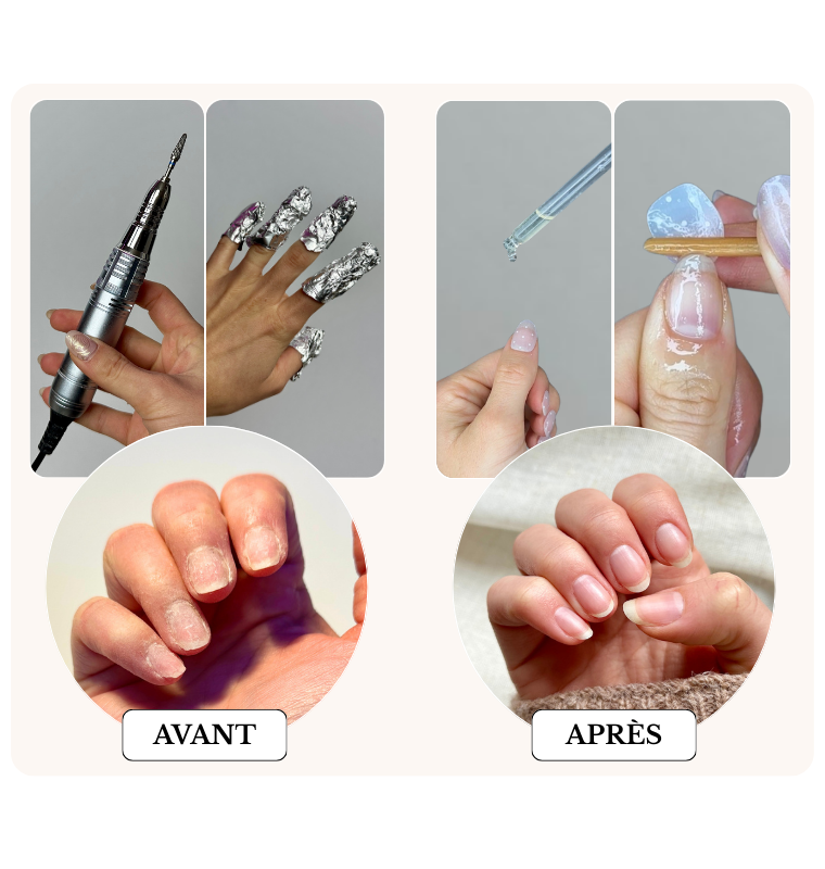 - Des poses en gel ou en semi-permanent qui finissent par laisser des ongles mous, fragilisés, parfois abîmés par la ponceuse ou les produits chimiques.
